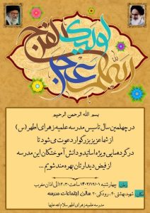 مدرسه علميه زهراي اطهر به مناسبت ولادت با سعادت صاحب الزمان (عج) و چهلمين سال تاسيس مدرسه، مراسمي در روز چهارشنبه، 1 اسفندماه 1403 برگزار ميكند.