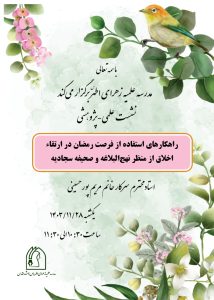 اين نشست با عنوان «راهكارهاي استفاده از فرصت رمضان در ارتقاء اخلاق از منظر نهج البلاغه و صحيفه سجاديه» با حضور استاد محترم، سركار خانم پورحسيني برگزار خواهد شد.